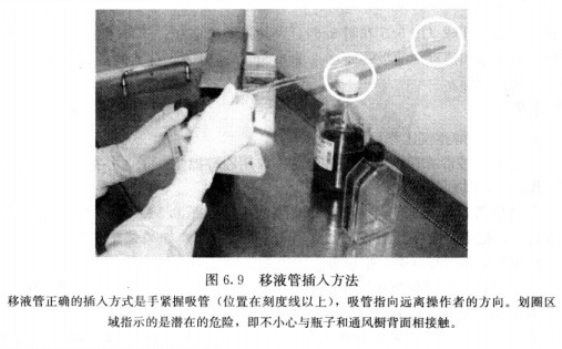 (a)如果是玻璃吸管,從盒中取出吸管時(shí).要保持待取吸管在盒中與其他吸管平行,并盡叮能少地接觸他們,特別是吸管頭部,如果拿著的吸管接觸了其他仍在盒內(nèi)的吸管尾端.則不能再使用它;把吸管插人移液器中,吸竹指向你的外側(cè),握在刻度上面部分,這樣,吸管進(jìn)人試劑瓶或培養(yǎng)瓶的部分將不會(huì)被污染(圖6.9).