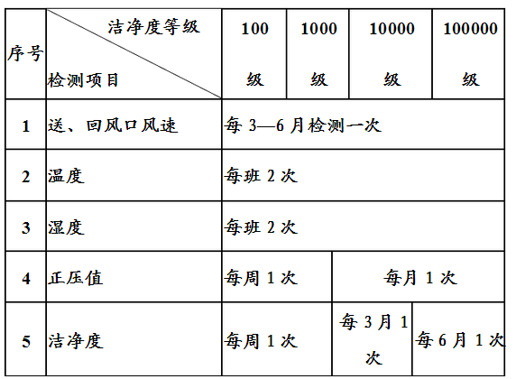 1、認(rèn)真做好潔凈空氣環(huán)境參數(shù)的檢測,分別做好記錄。 2、潔凈空氣環(huán)境參數(shù)檢測項(xiàng)目及周期如下表所示。 必要時(shí)進(jìn)行潔凈室空氣有害氣體成分的檢測和分析。