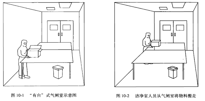 3) 氣閘室充分自凈:讓氣閘室處在無人狀態(tài)下數(shù)分鐘的時間,以便將污染降**這樣 的濃度:當潔凈室一邊的門打開時,潔凈室不會受到大的影響。為實現(xiàn)這一目的,可安裝 內(nèi)外門的聯(lián)鎖計時裝置或指示燈。當潔凈室側門自動打開或指示燈點亮后,潔凈室的人員 進人氣閘室,拿起物品后離開氣閘室,如圖10-2所示。