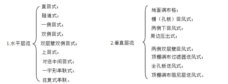 1.有些層流(筆直式,水平式) 2.亂流加潔凈作業(yè)臺式 3.亂流加有些層流式 4.作業(yè)臺地道式 5.地道潔凈室式 6.潔凈管道式