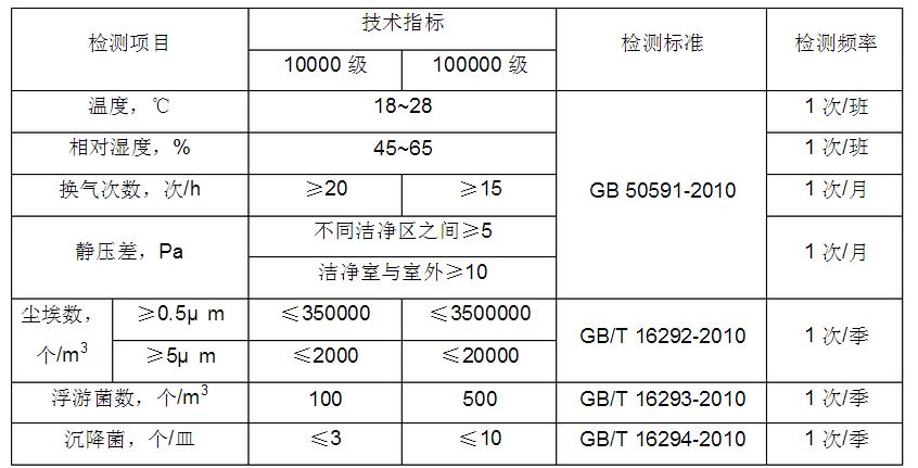 1.1  為了保證潔凈度滿足工藝需求,必須對(duì)潔凈室內(nèi)潔凈度進(jìn)行檢測(cè)。 1.2  生產(chǎn)管理員負(fù)責(zé)每班次上下午監(jiān)控記錄潔凈室溫濕度和靜壓差,并記錄。 1.3  檢測(cè)周期:檢測(cè)頻率見下表: